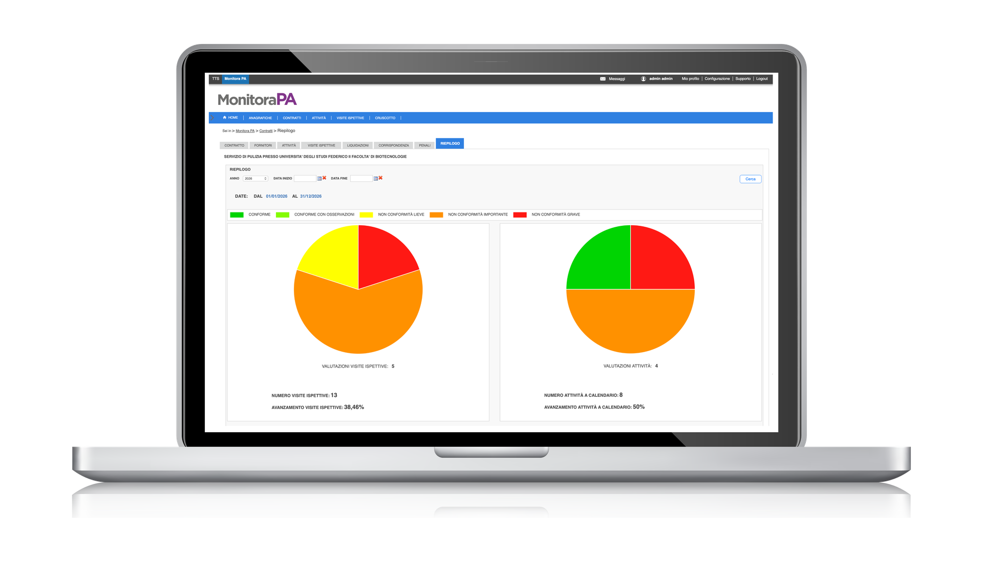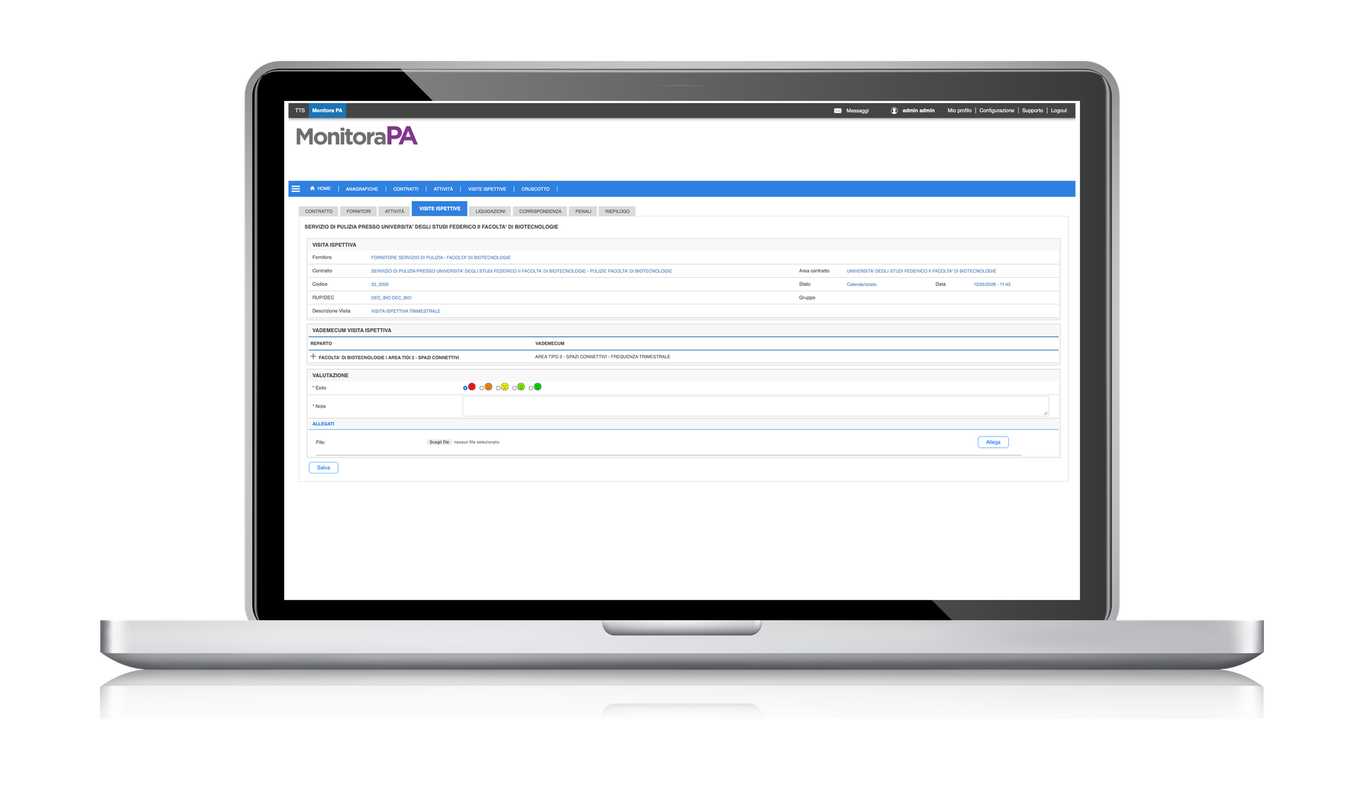 La piattaforma, disponibile in cloud, permette alla stazione appaltante, con riferimento ai suoi funzionari con ruolo di RUP e DEC, il caricamento e la gestione dei contratti di fornitura, servizi e materiale, con la possibilità di monitorare la corretta esecuzione, le non conformità, la calendarizzazione dei servizi, la documentazione correlata. La piattaforma consente la tracciabilità di ogni servizio reso e l’analisi delle inadempienze e/o delle opere ordinarie e straordinarie previste dal contratto.
