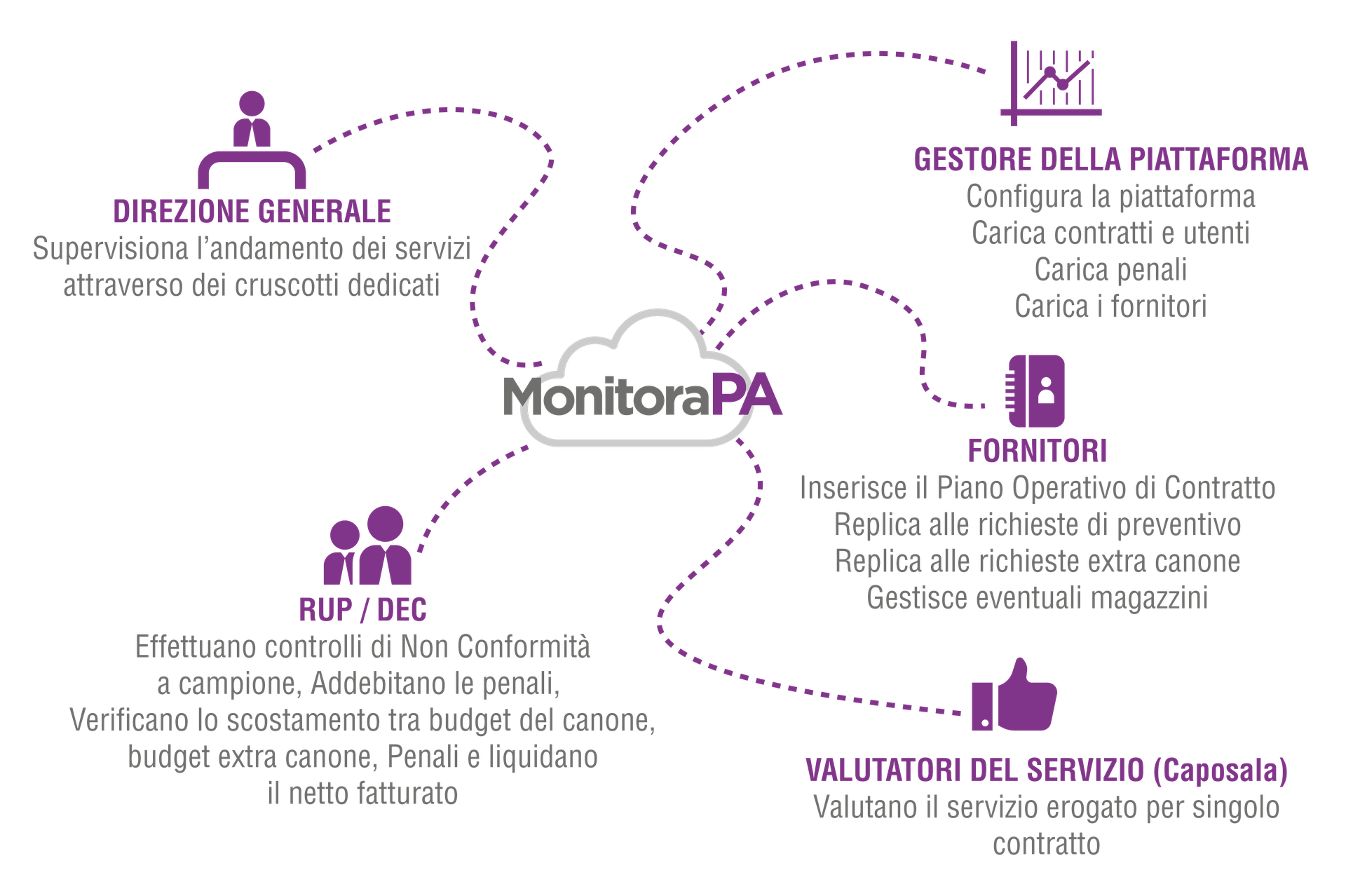 Monitora PA è una piattaforma che opera sia in cloud che presso server farm del cliente, in grado di gestire l’accesso dei vari utenti per ruolo e permessi, permettendo dunque la configurazione di più ruoli (amministratore del sistema, ufficio tecnico, direzione generale, RUP, DEC, operatore del fornitore, gestore contratto del fornitore, etc.)